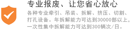 首特钢报废汽车回收拆解公司为了提供报废车回收更好的服务,我们不仅开展免费拖车,免费办理报废汽车解体手续,而且还推出了常德报废车回收一条龙服务,以“高效,便捷办理报废车”为服务宗旨。只需您拨打电话,便可享受首特钢报废车回收高效便捷服务,首特钢机动车解体厂欢迎社会各界人士来厂考察,我们将竭诚为您提供车辆注销全程服务!